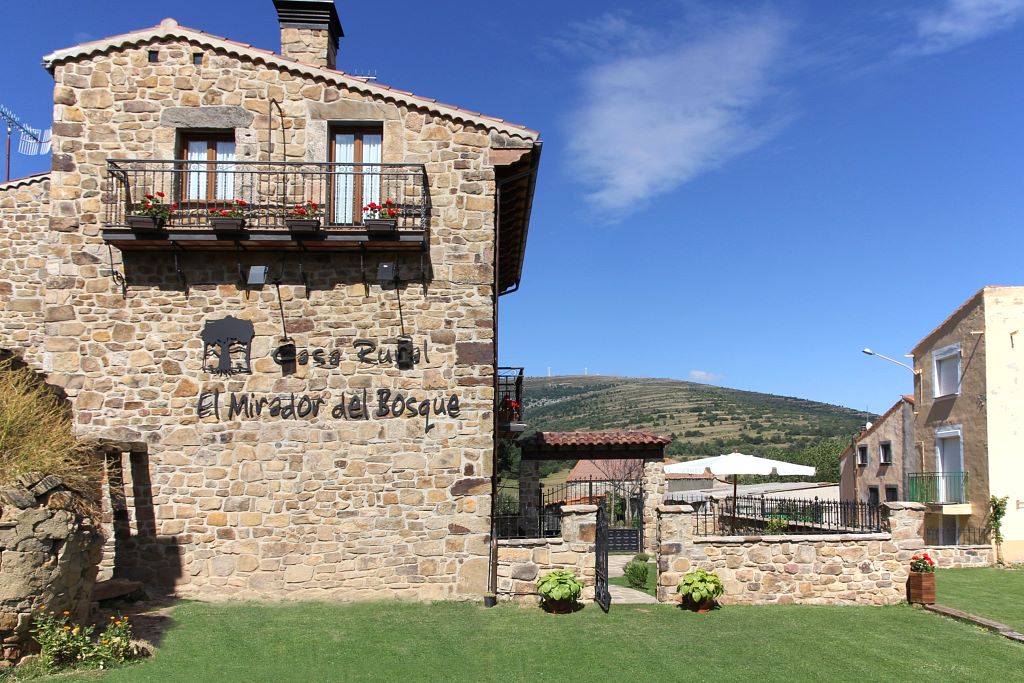 La casa rural El Mirador del Bosque se divisa desde su exterior, con respecto a las viviendas de su entorno, como un edificio alto de aspecto rústico a la vez que señorial. Su estructura de piedra y sus complementos decorativos en madera, le proporcionan un estilo elegante que, manteniendo la línea propia de las construcciones de La Póveda, transmite la personalidad de la familia Pérez Pérez, dueña de la misma.