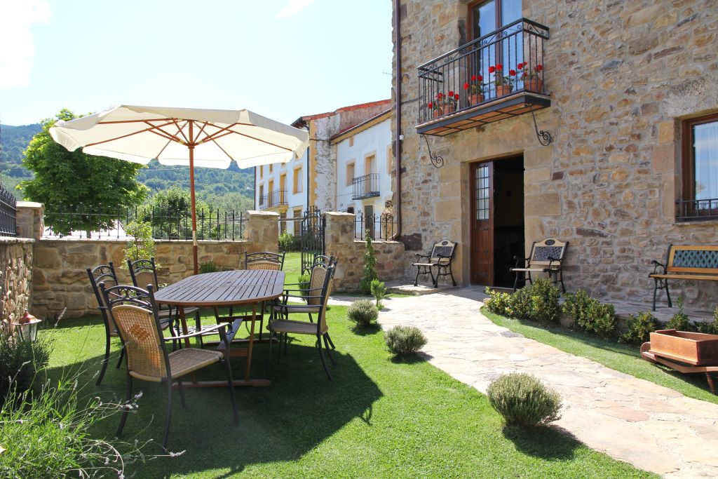 El acceso a la casa se efectúa a través de un imponente y refinado portón que en su contorno combina piedra, madera y teja y cuya puerta de forja deja entrever, a través de sus barrotes, un cálido y cuidado jardín ideal para disfrutar del aire puro de la zona, aromatizado con la fragancia del tomillo, el romero y las flores de lavanda que salpican el verde. Y, por supuesto, no falta la presencia del acebo, imagen representativa de la comarca.