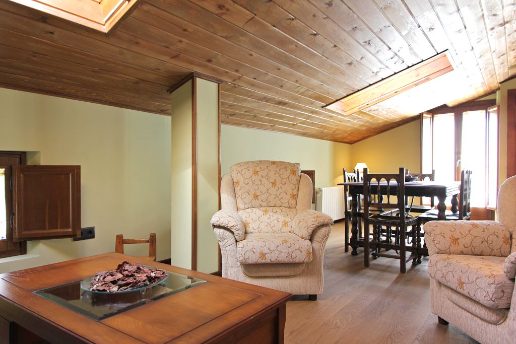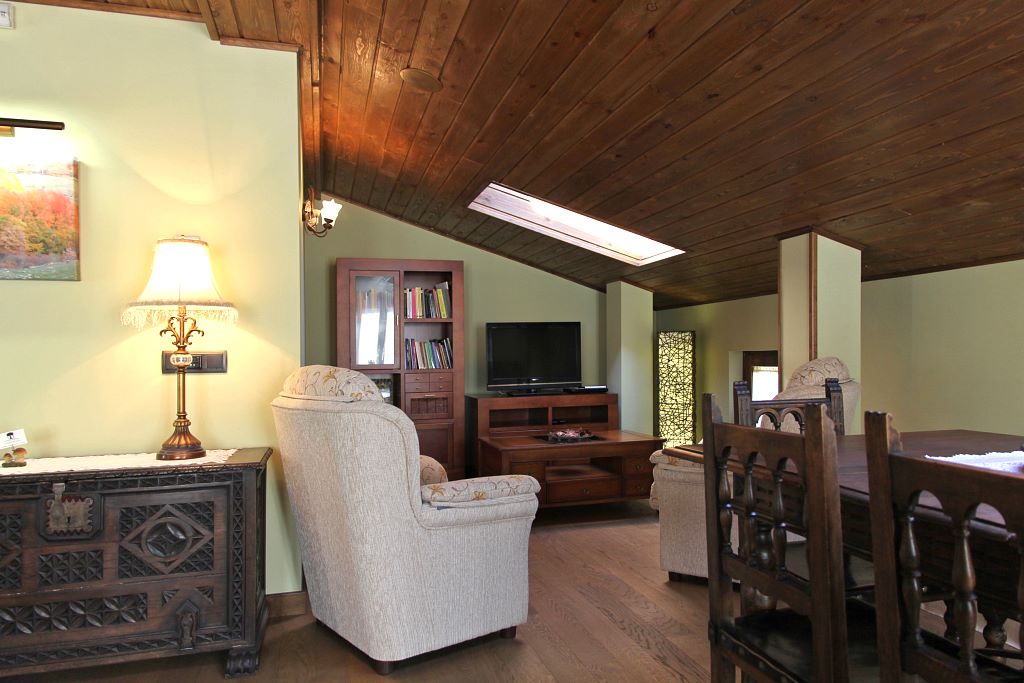 Seguramente la parte más acogedora de la casa se encuentre en la última planta, una zona aboardillada y espaciosa que aporta calidez en todos sus puntos. Un rincón para el descanso, la lectura, la reflexión y la tertulia. Desde esta zona la vista se dirige hacia la belleza del monte que, a modo de perfecta panorámica, te envuelve y te contagia su armonía y serenidad. Sin lugar a dudas, un espacio cargado de romanticismo y comodidad en el que no puede faltar la lectura de un buen libro de poesía.